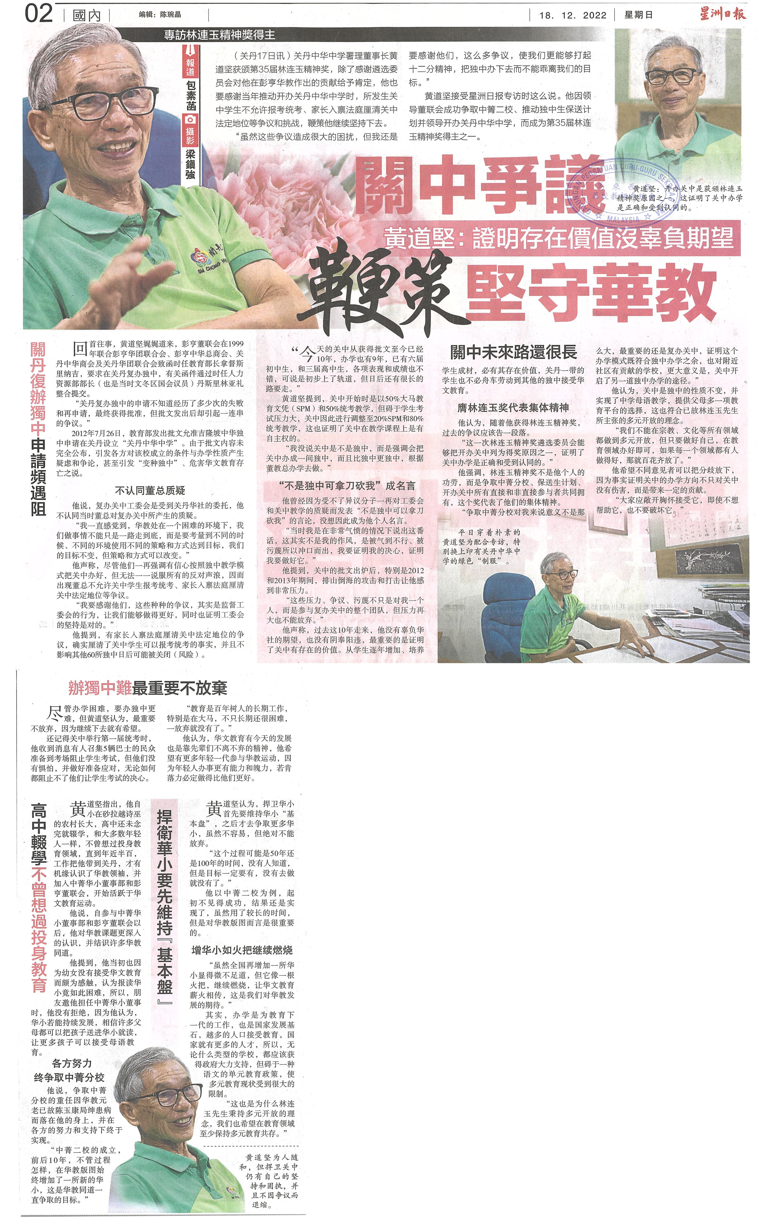 关中争议 黄道坚:证明存在价值没辜负期望 鞭策坚守华教