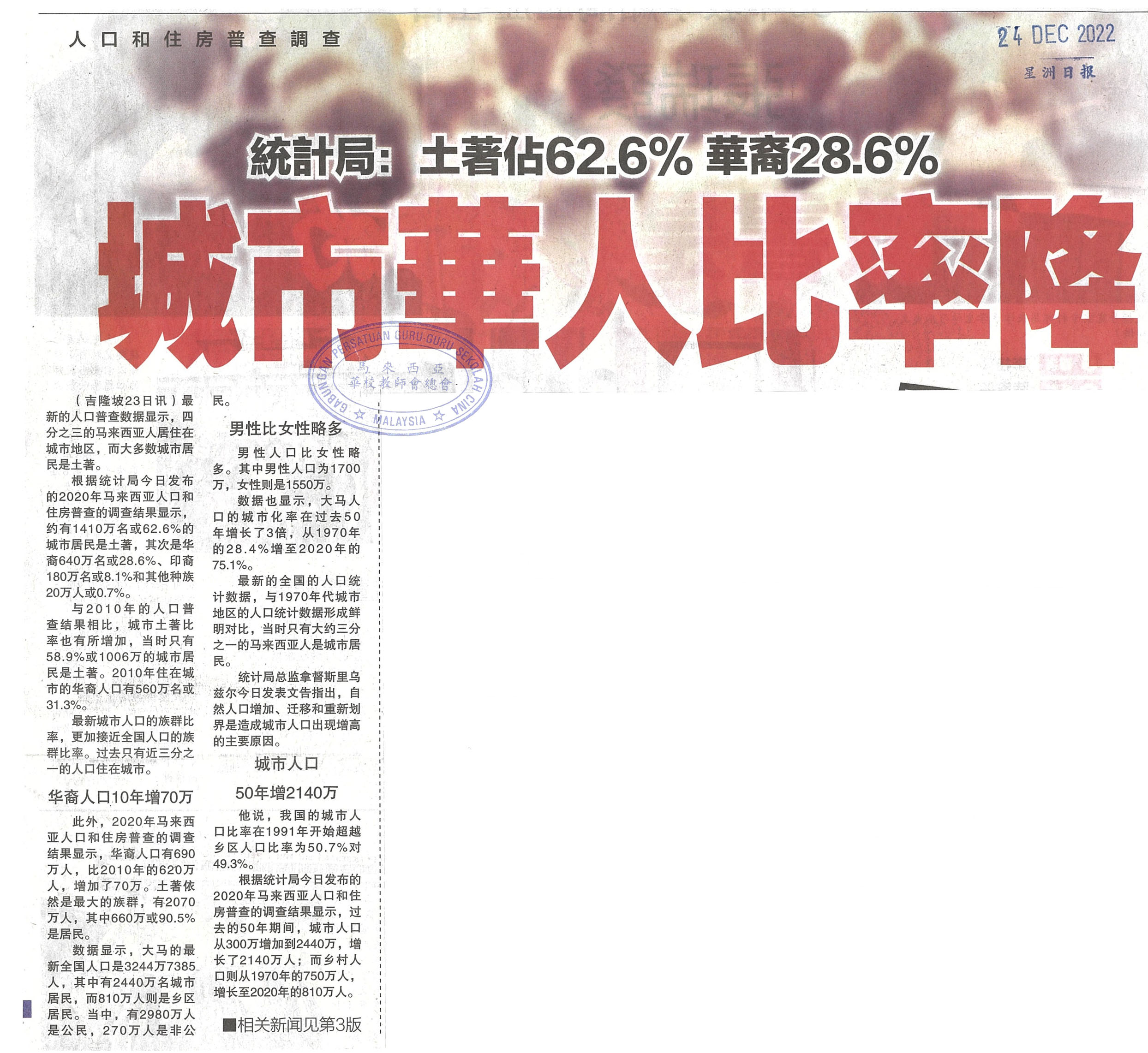 统计局:土著占62.6% 华裔28.6% 城市华人比率降 WhatsApp 上一篇文章: 颜登逸:重纳霹财案教育拨款 独中贡献受肯定 上一页 下一篇文章: 拉兹曼:若承认统考“教育两种制度忧不公” 下一页
