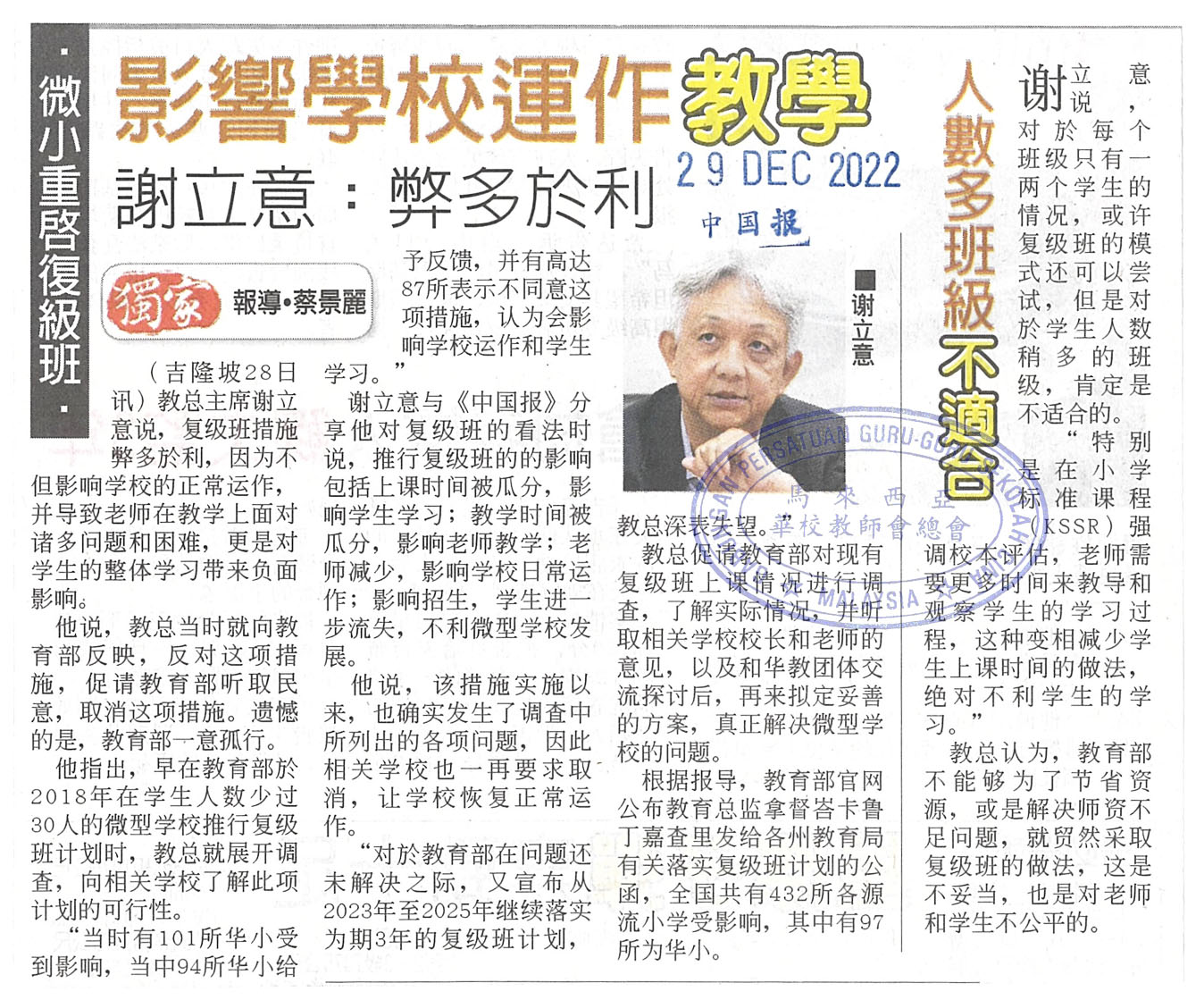 微小重启复级班 影响学校运作教学 谢立意:弊多于利