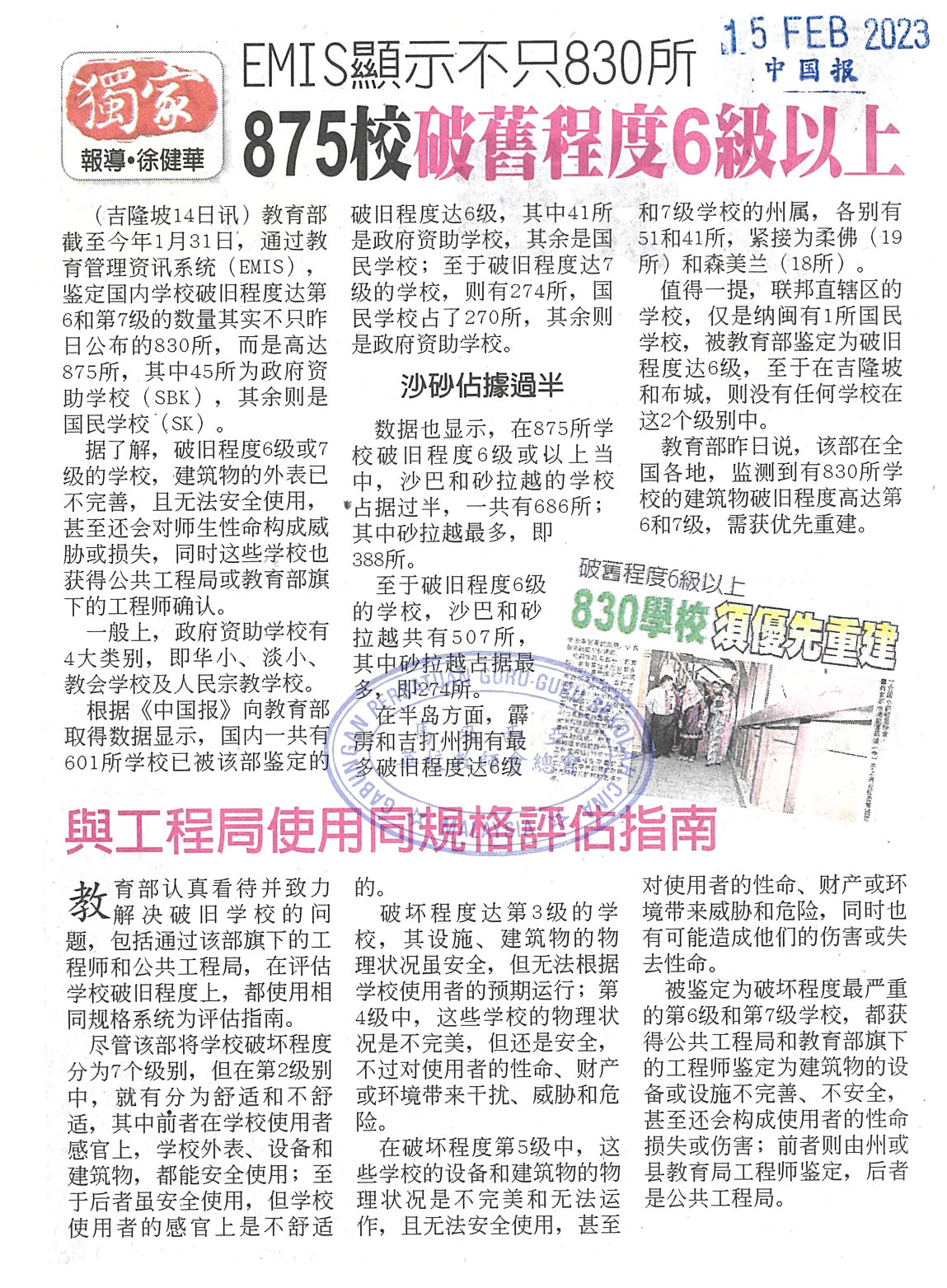 EMIS显示不只830所 875校破旧程度6级以上 WhatsApp 上一篇文章: 乌冷发展华小工委会:解决爆满问题 建议蕉赖皇冠城增建华小 上一页 下一篇文章: 择日详谈师资课题 林慧英定期会董教总 下一页