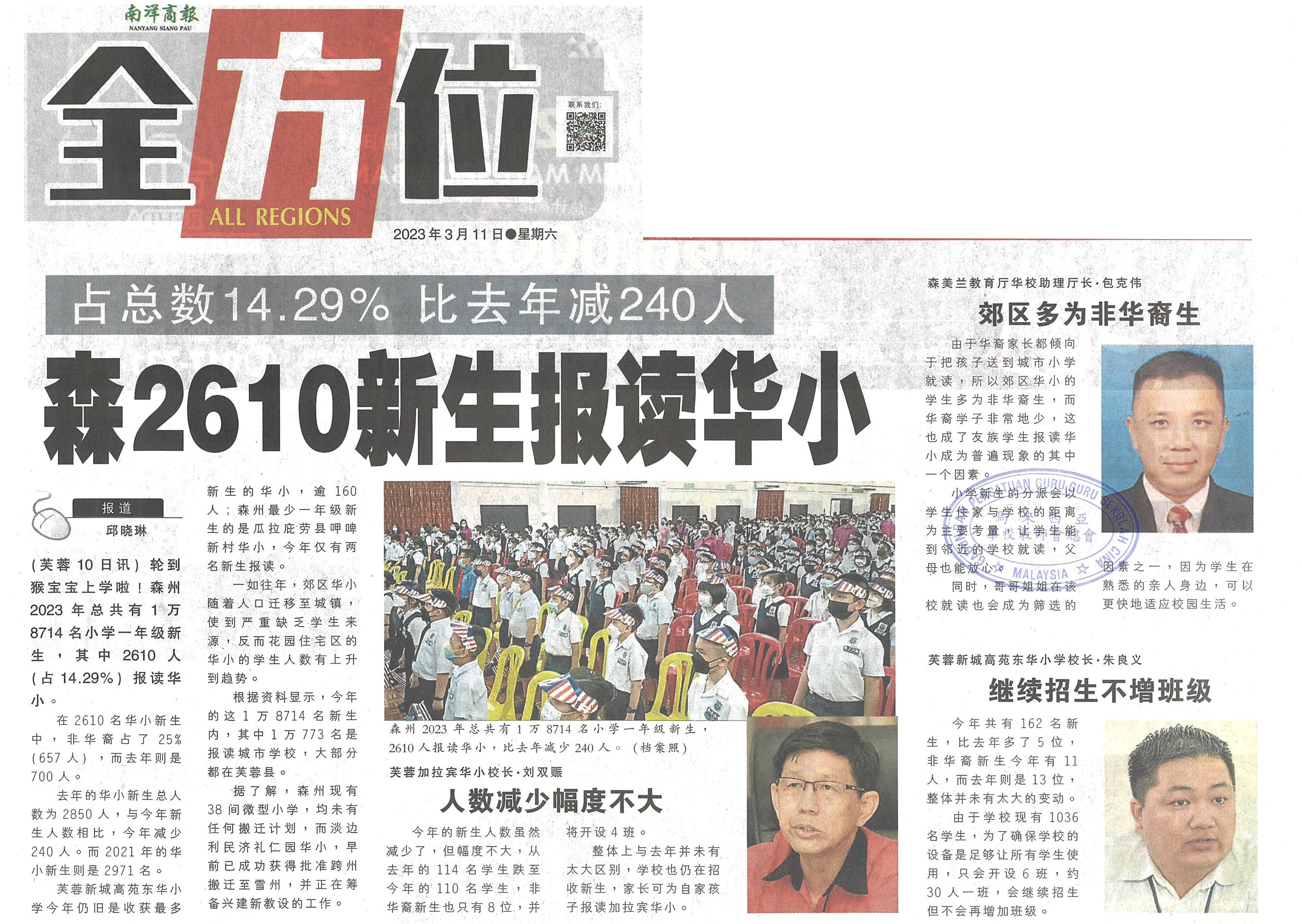 占总数14.29% 比去年减240人 森2610新生报读华小 WhatsApp 上一篇文章: 华小生《三国演义》搬上舞台“周瑜张飞”说国语 赢喝彩 上一页 下一篇文章: 郭可枫:桌椅不敷应用 中正申请拨款扩建食堂 下一页