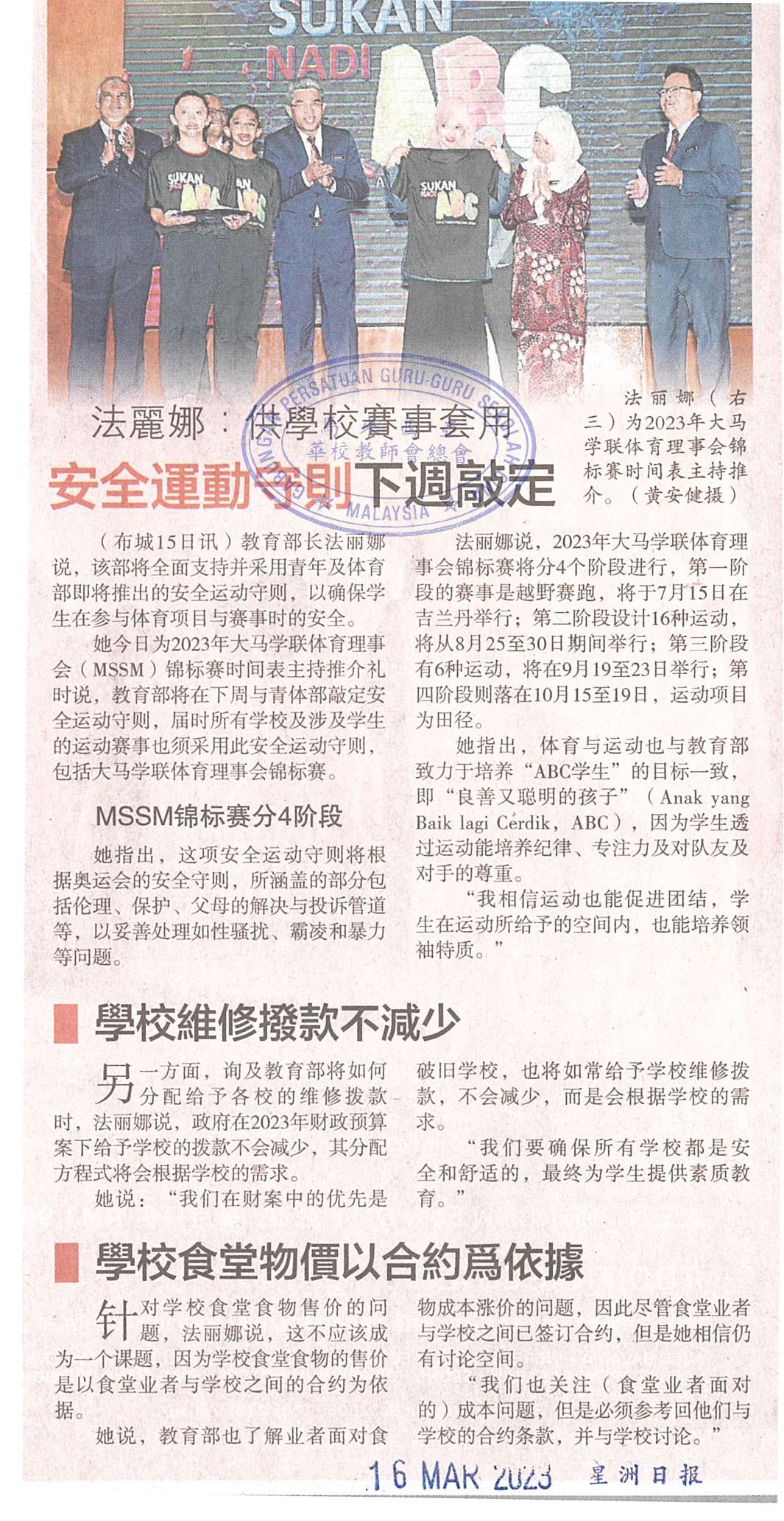 法丽娜:供学校赛事套用 安全运动守则下周敲定