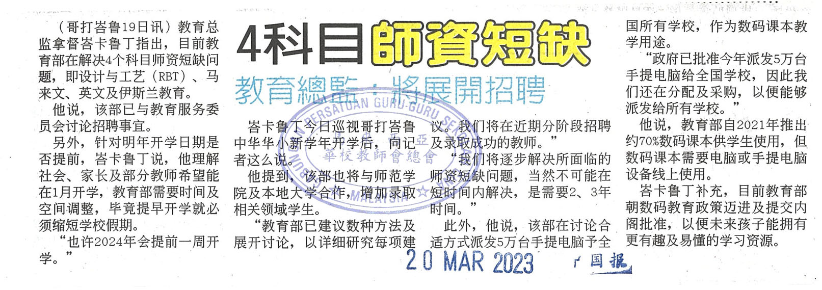 上一篇文章: 教育总监:或缩短学校假期 明年料提前一周开学