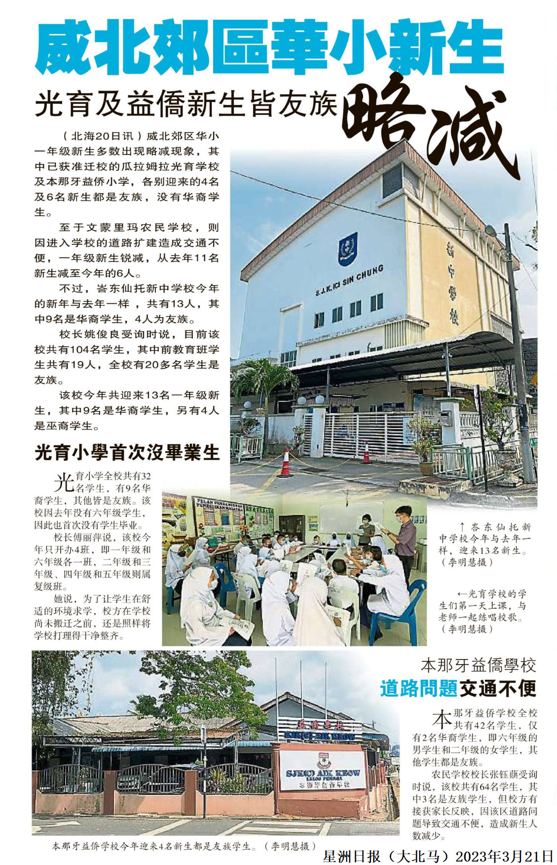 威北郊区华小新生略减 光育及益侨新生皆友族