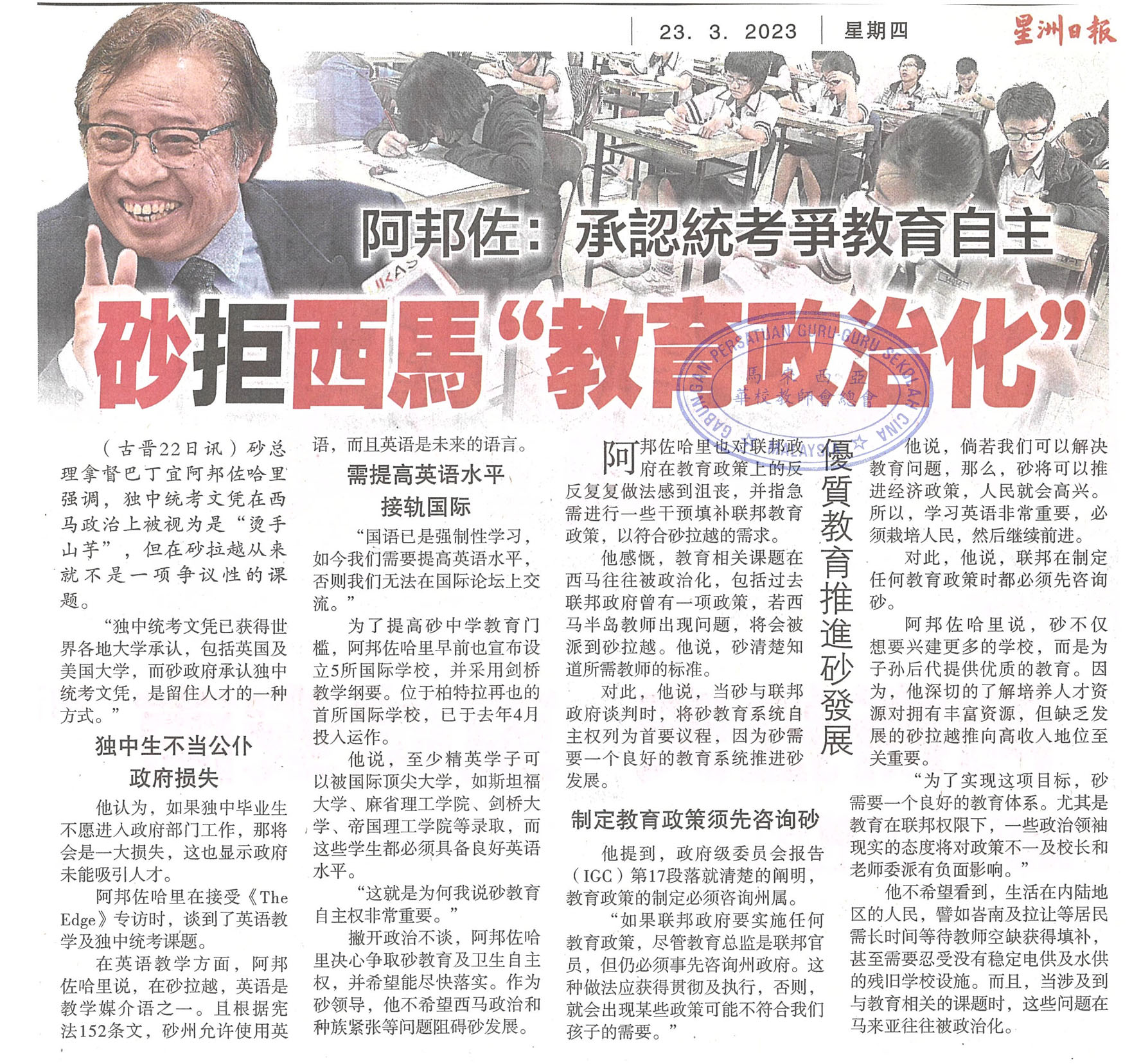 阿邦佐:承认统考争教育自主 砂拒西马“教育政治化”