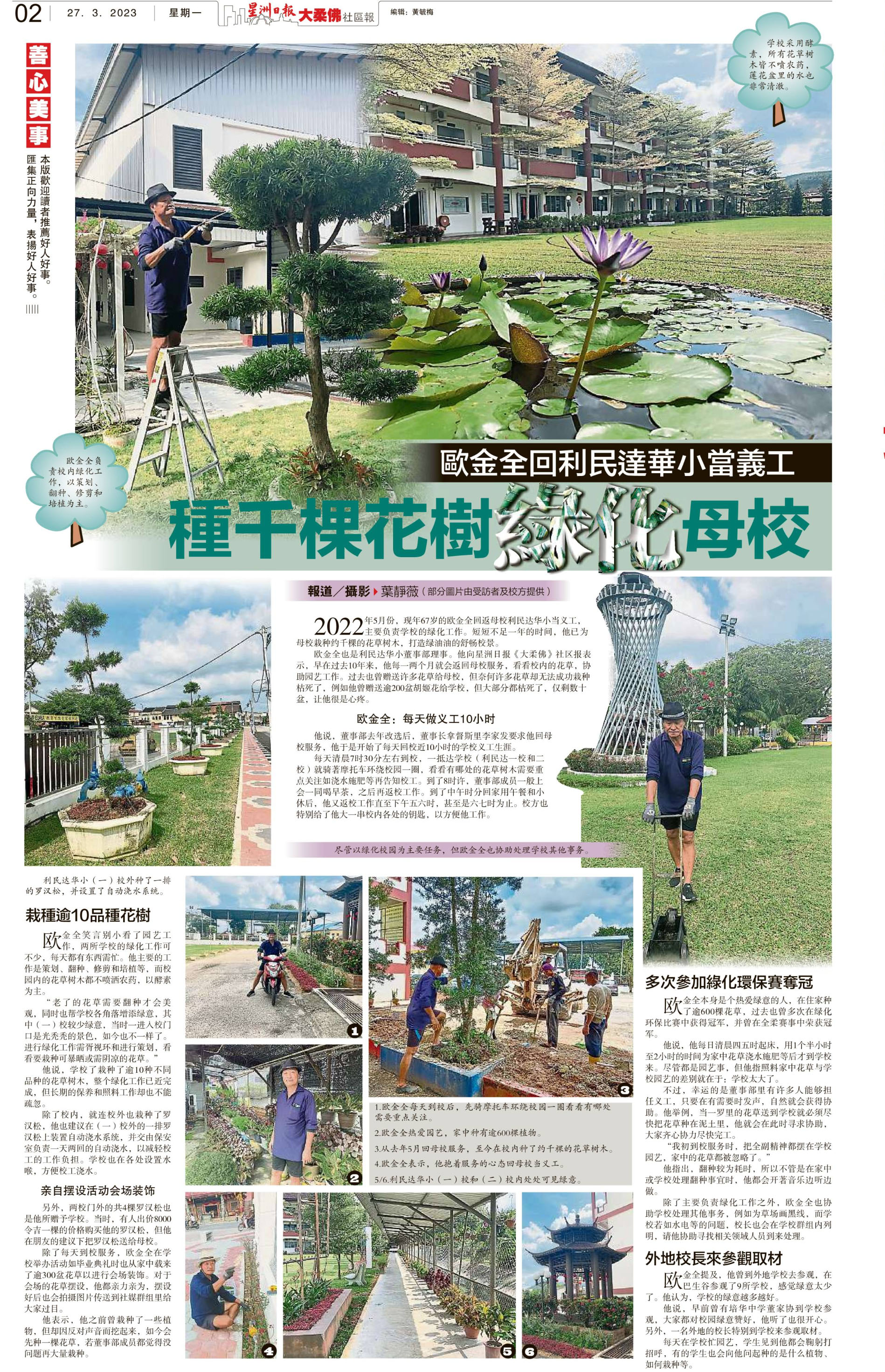 欧金全回利民达华小当义工 种千棵花树绿化母校 WhatsApp 上一篇文章: 高华小学获准开办学前教育班 预先为友族生打好中文基础 上一页 下一篇文章: 校方:若调回1月开学 需花3年多上两周课 下一页