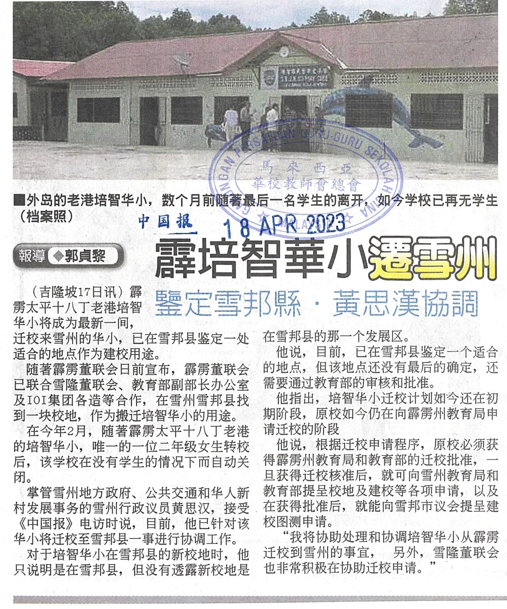 霹培智华小迁雪州 鉴定雪邦县.黄思汉协调 WhatsApp 上一篇文章: 林慧英:100点以上暂停课外活动 空污指数逾200点停课 上一页 下一篇文章: 教育部设“吹哨者系统”不满教师校方可投诉 下一页