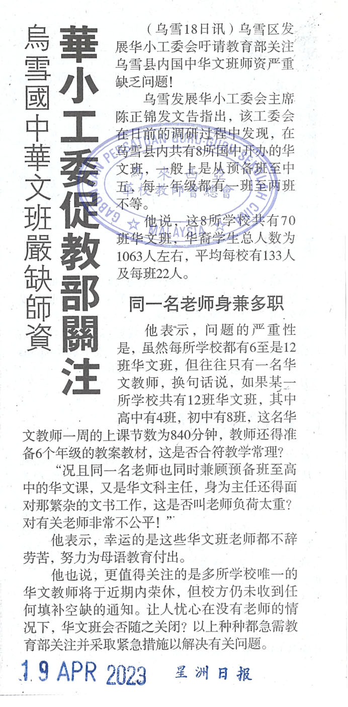 乌雪国中华文班严缺师资 华小工委会促教育部关注