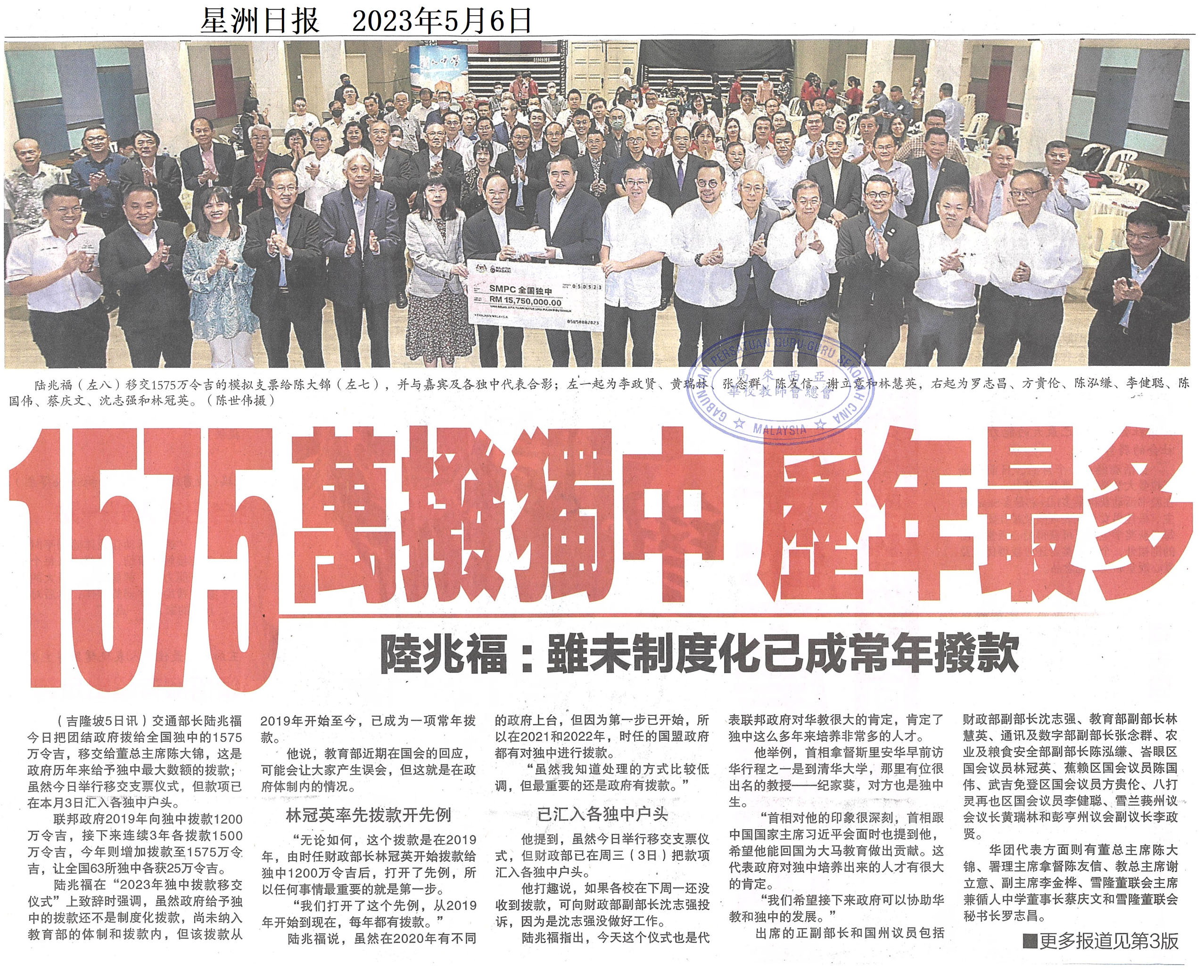 1575万拨独中 历年最多 陆兆福:虽未制度化已成常年拨款 WhatsApp 上一篇文章: 班丹中华华小建委会:预计数百万 3建设不应由学校承担 上一页 下一篇文章: 2023年独中拨款移交仪式 下一页
