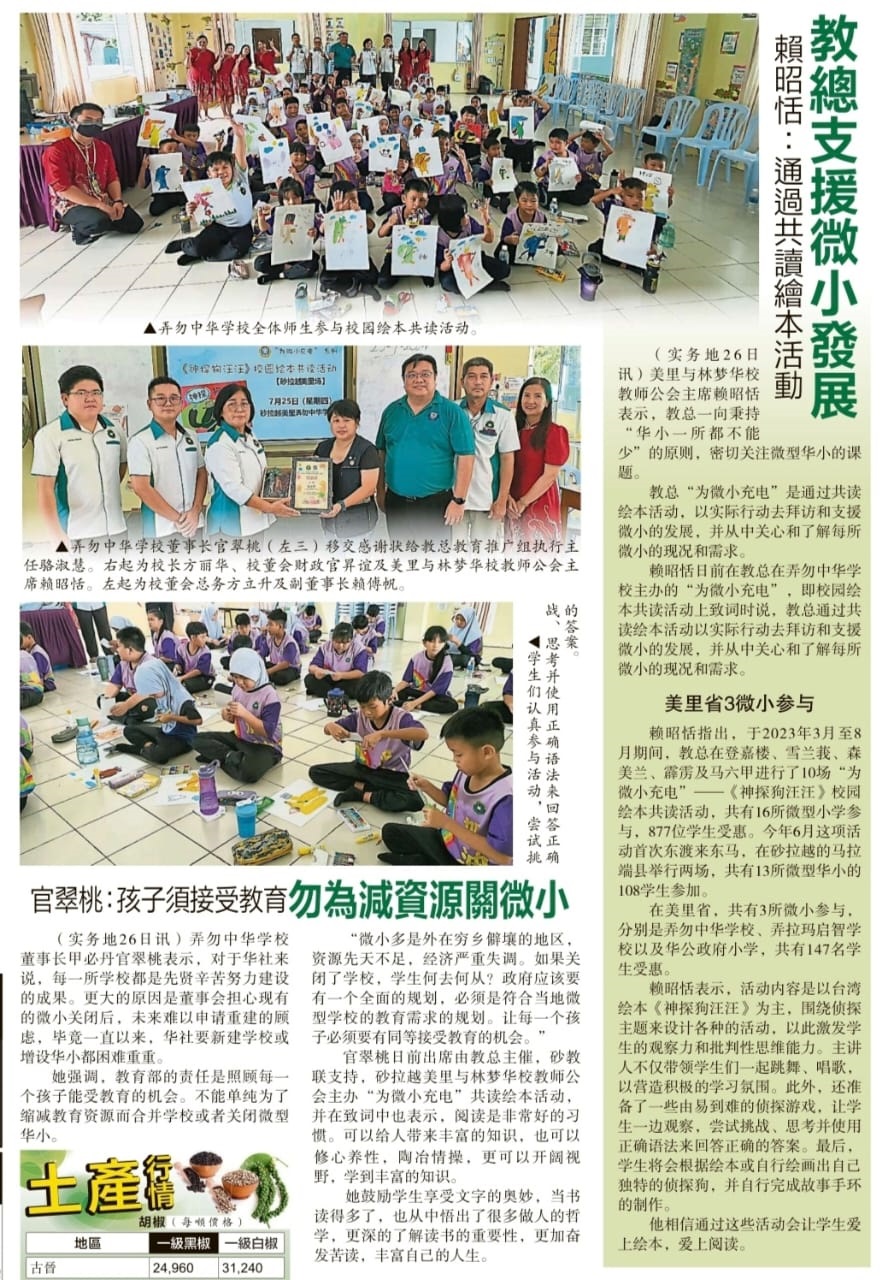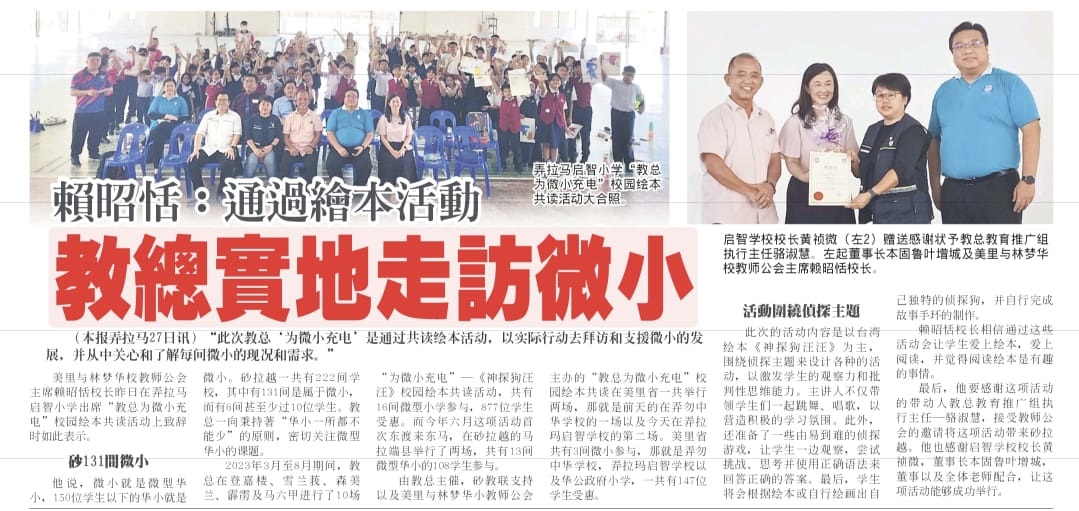 “为微小充电”系列——《神探狗汪汪》校园绘本共读活动,已在全马各地华小校园展开了一年半的时间,这次终于轮到砂拉越美里的微型小学有机会受惠了。此次获得砂教联支持、由砂拉越美里与林梦教师会的居中协调和安排,教总特别以共读活动的方式前去支援美里当地的3所微小,共有145位学生受惠。