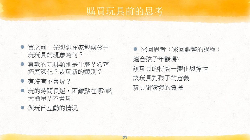 孙老师强调,她是集合了各大研究学者的理论,以及自己观察小朋友玩游戏的经验分享。所以,她和参与者分享了自己对玩具选择以及购买玩具前的思考。